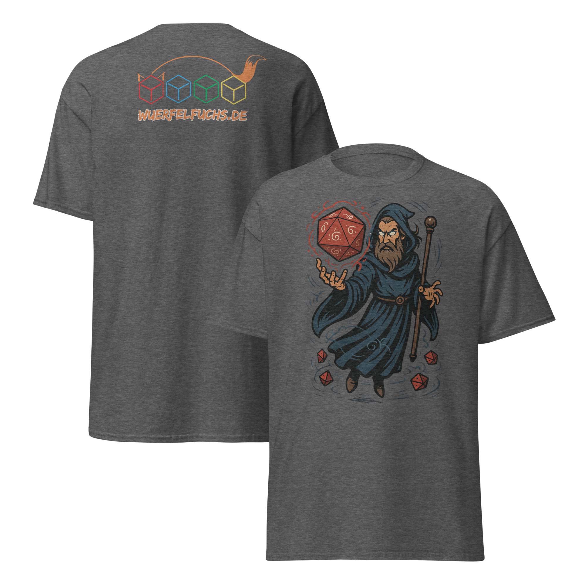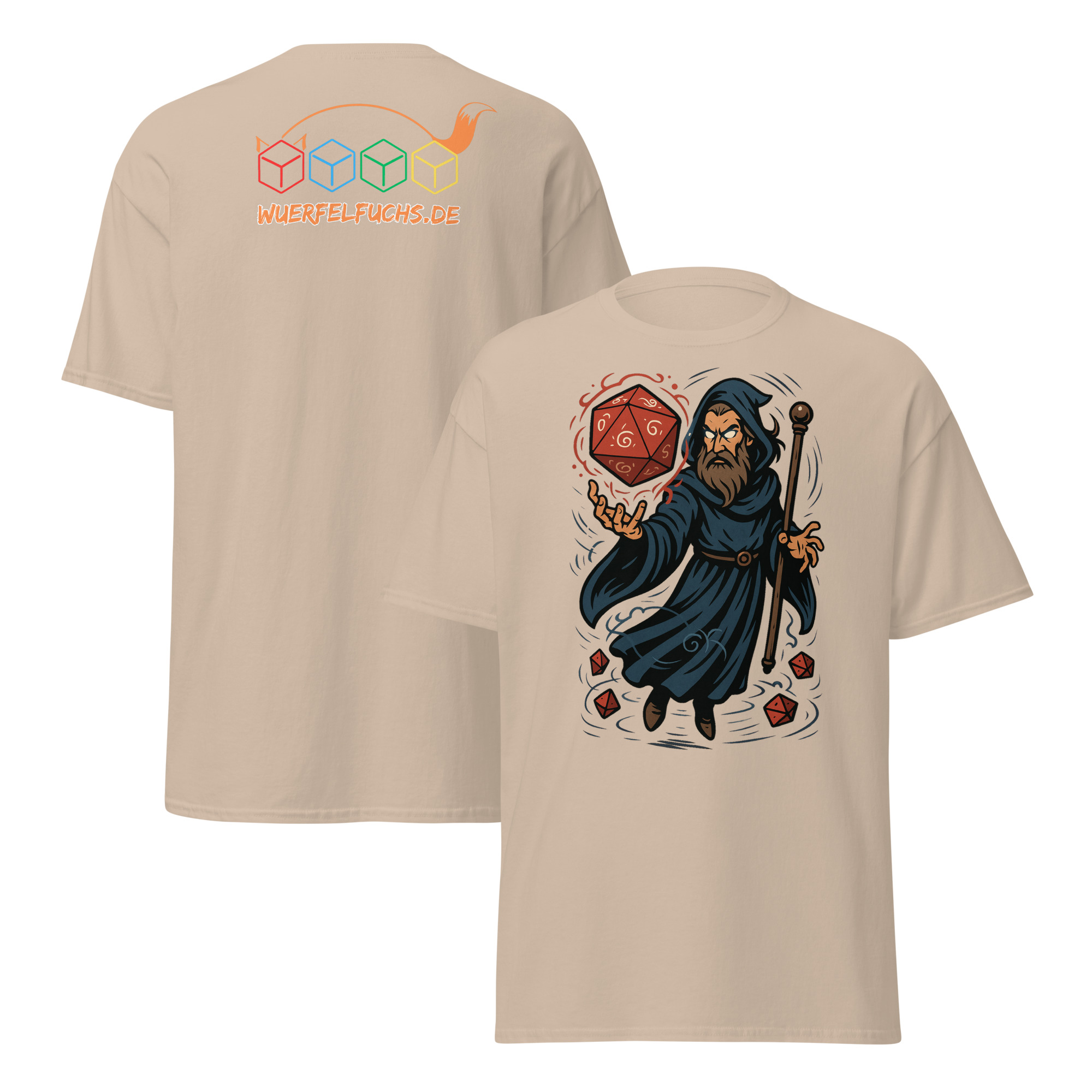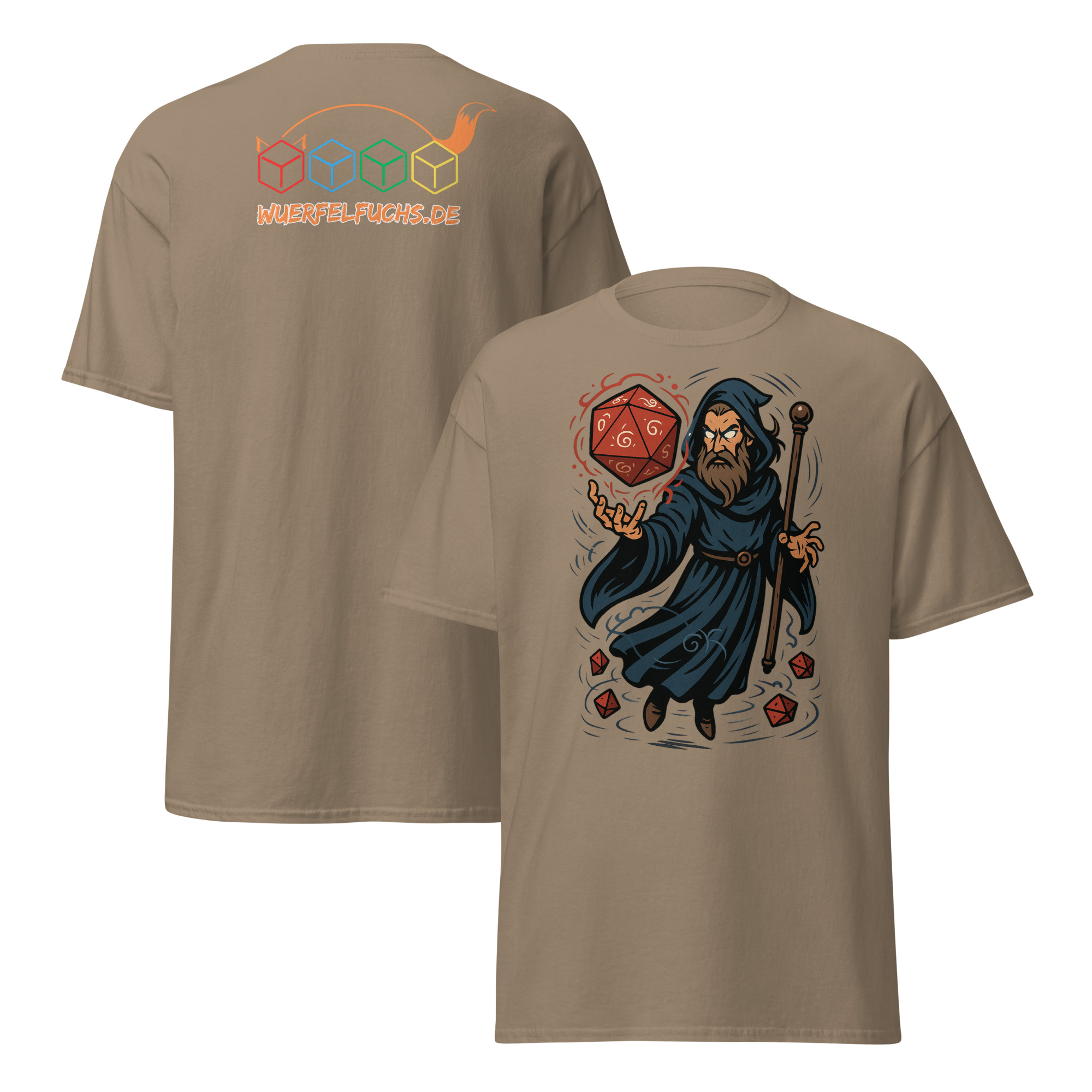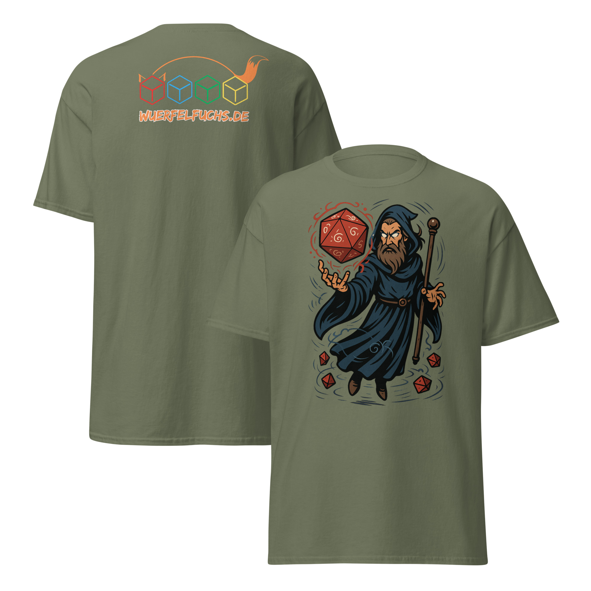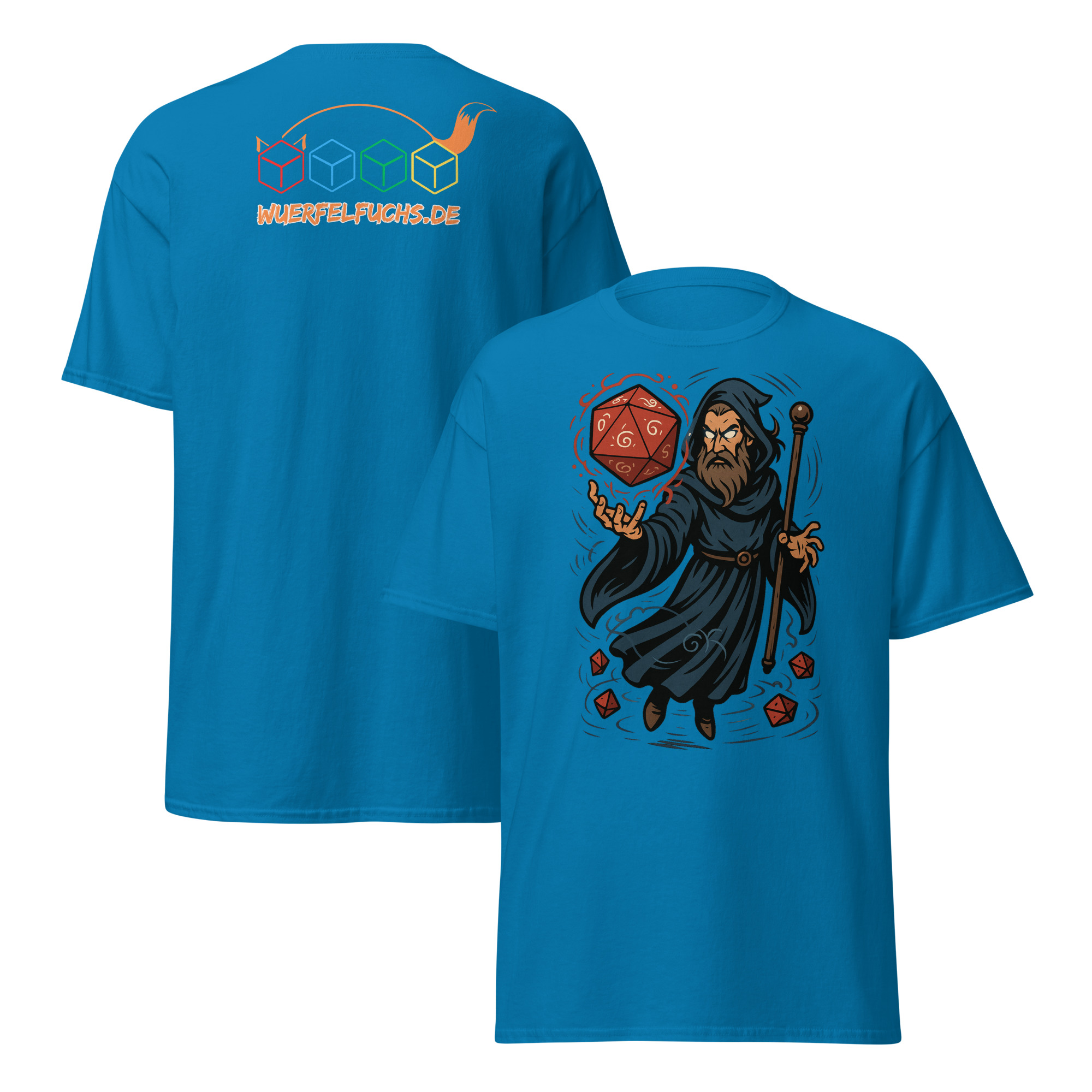 Ein Zauberer wirkt Magie mit einem leuchtenden W20 – ein dynamisches Fantasy-Motiv für Fans von Würfeln und Magie.