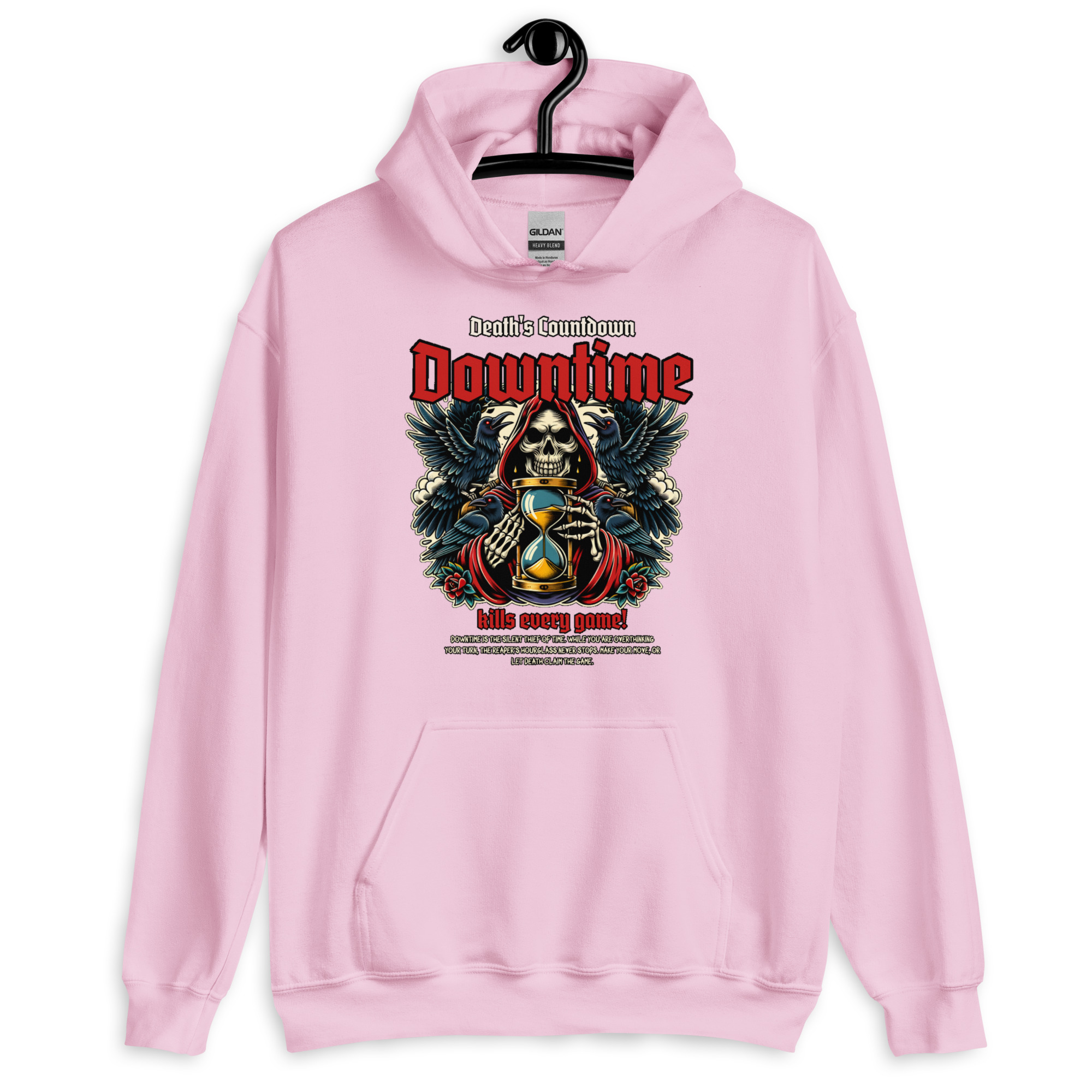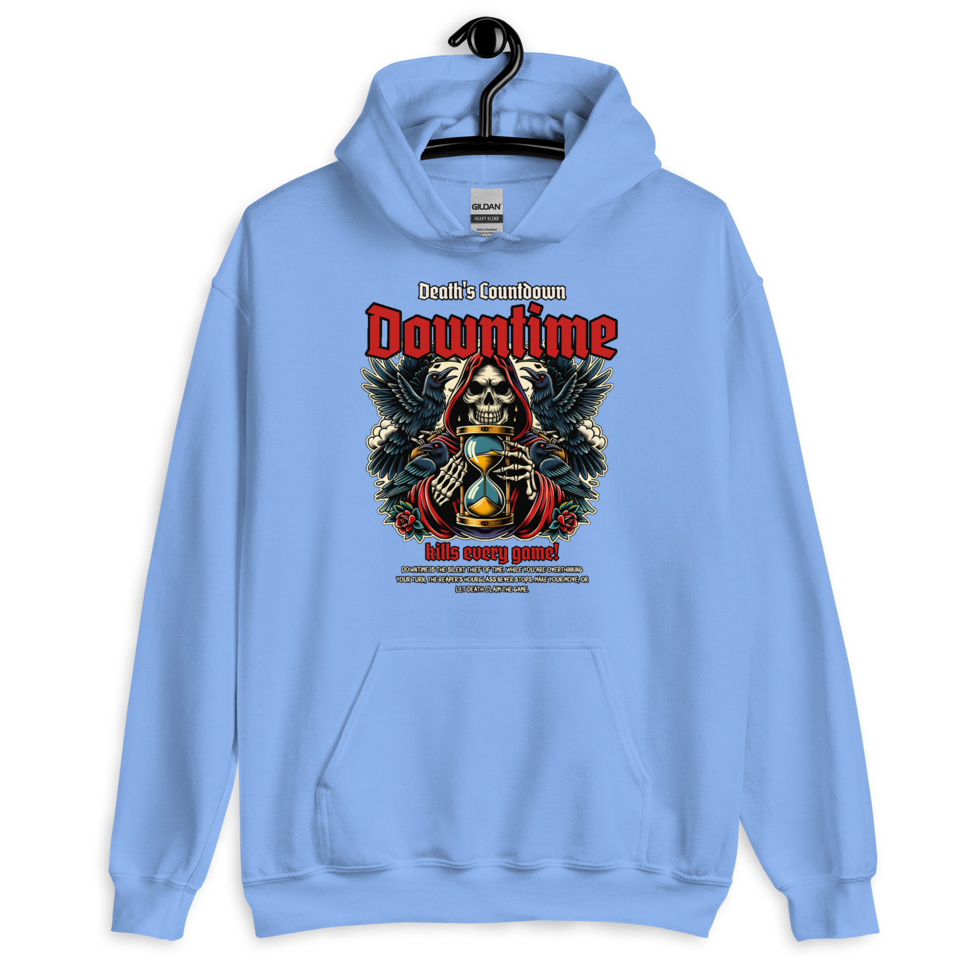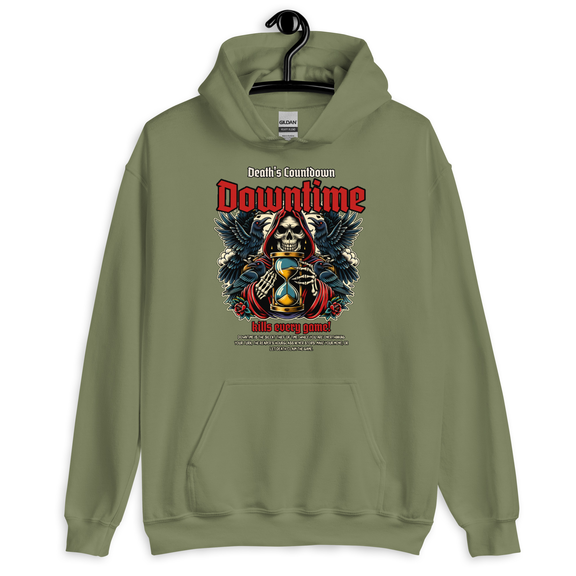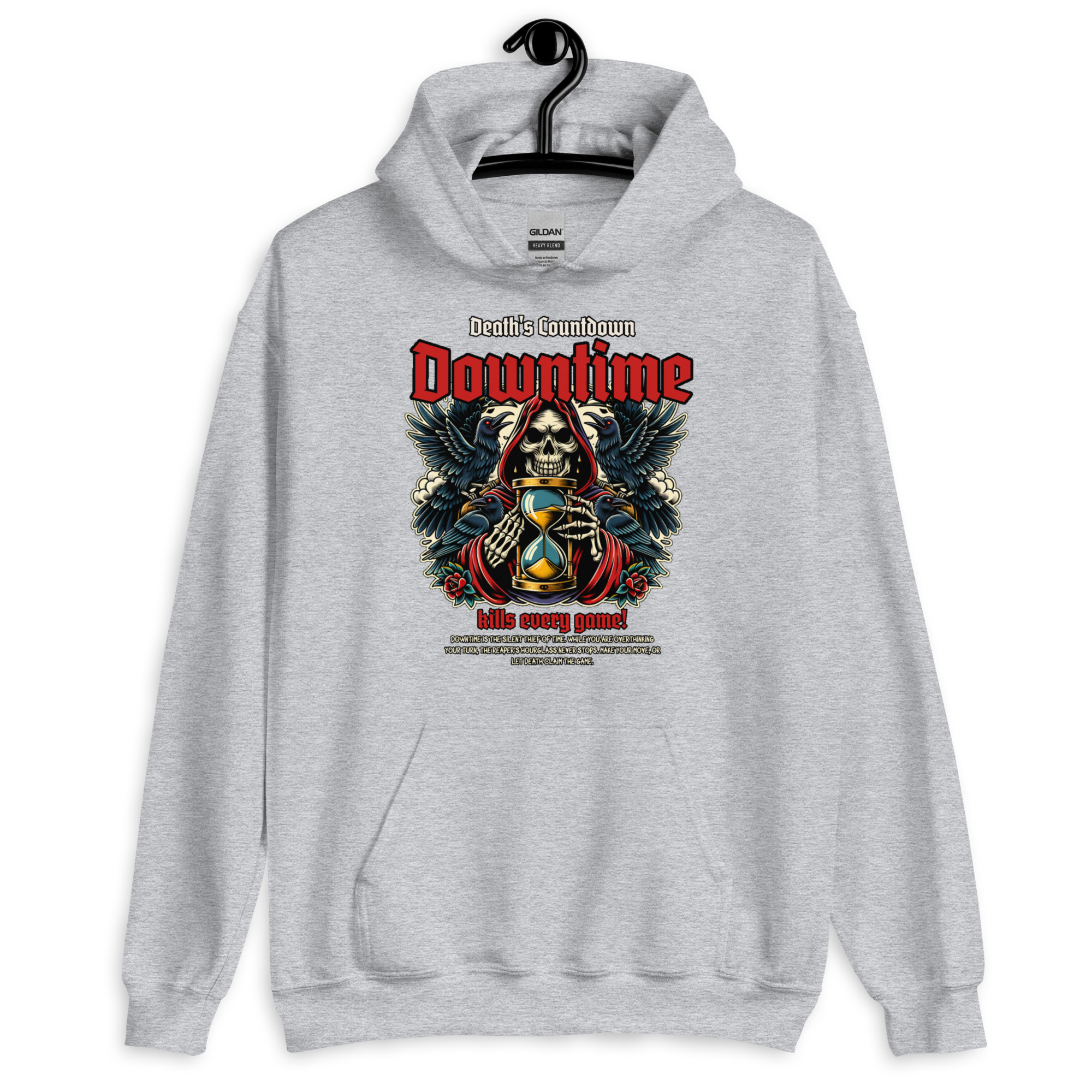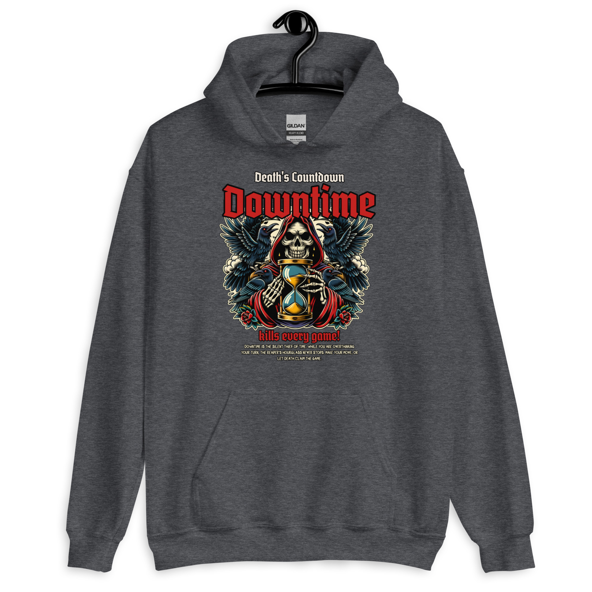 Downtime ist der stille Dieb der Zeit. Während du noch über deinen nächsten Spielzug grübelst, steht die Sanduhr des Sensenmanns niemals still. Dieses Design ist ein Tribut an alle Tabletop- und Brettspiel-Runden, in denen jede Sekunde zählt. Triff deine Entscheidung – oder lass den Tod das Spiel beenden.