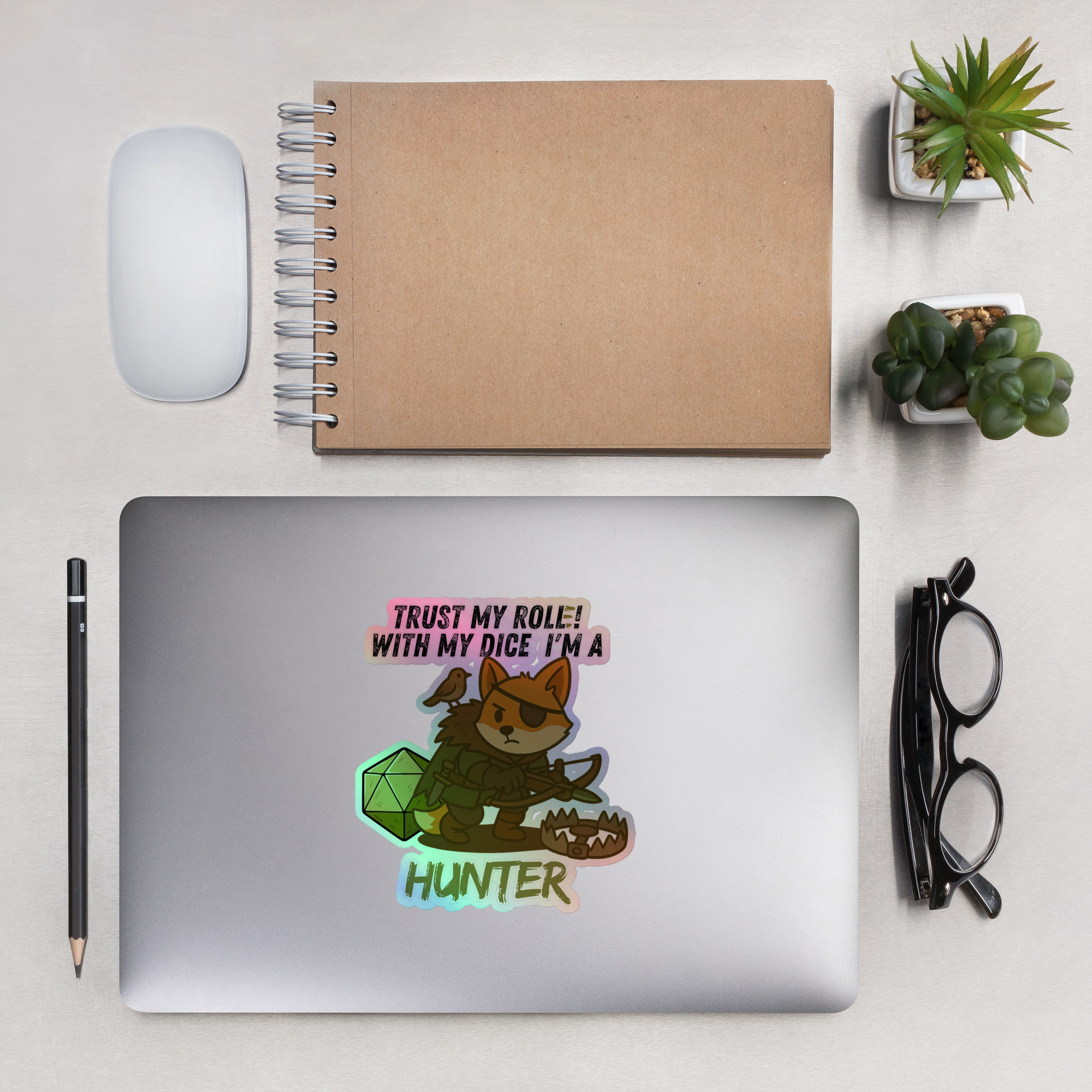 Vertraue seinem Wurf! Mit seinem W20 ist er ein zielsicherer Jäger-Fuchs. Die Falle ist gestellt, die Armbrust im Anschlag. Immer mit dabei, seines Volgelfreund, We-Vier. Dieses Design ist Teil der “DiceFox – Trust my roll(e)” Serie.