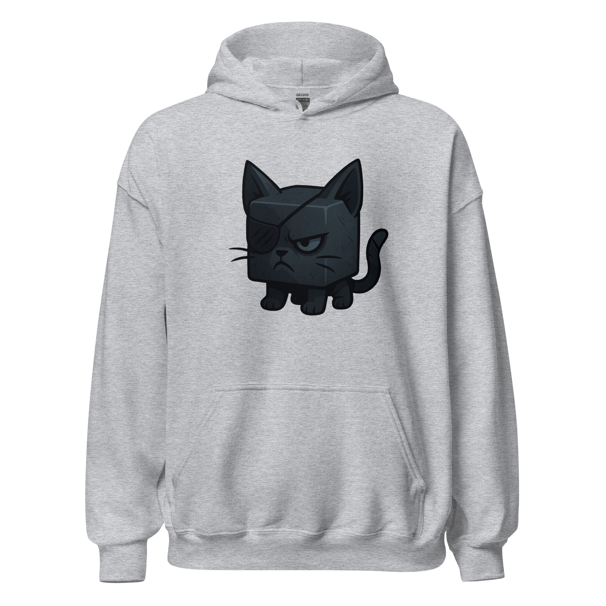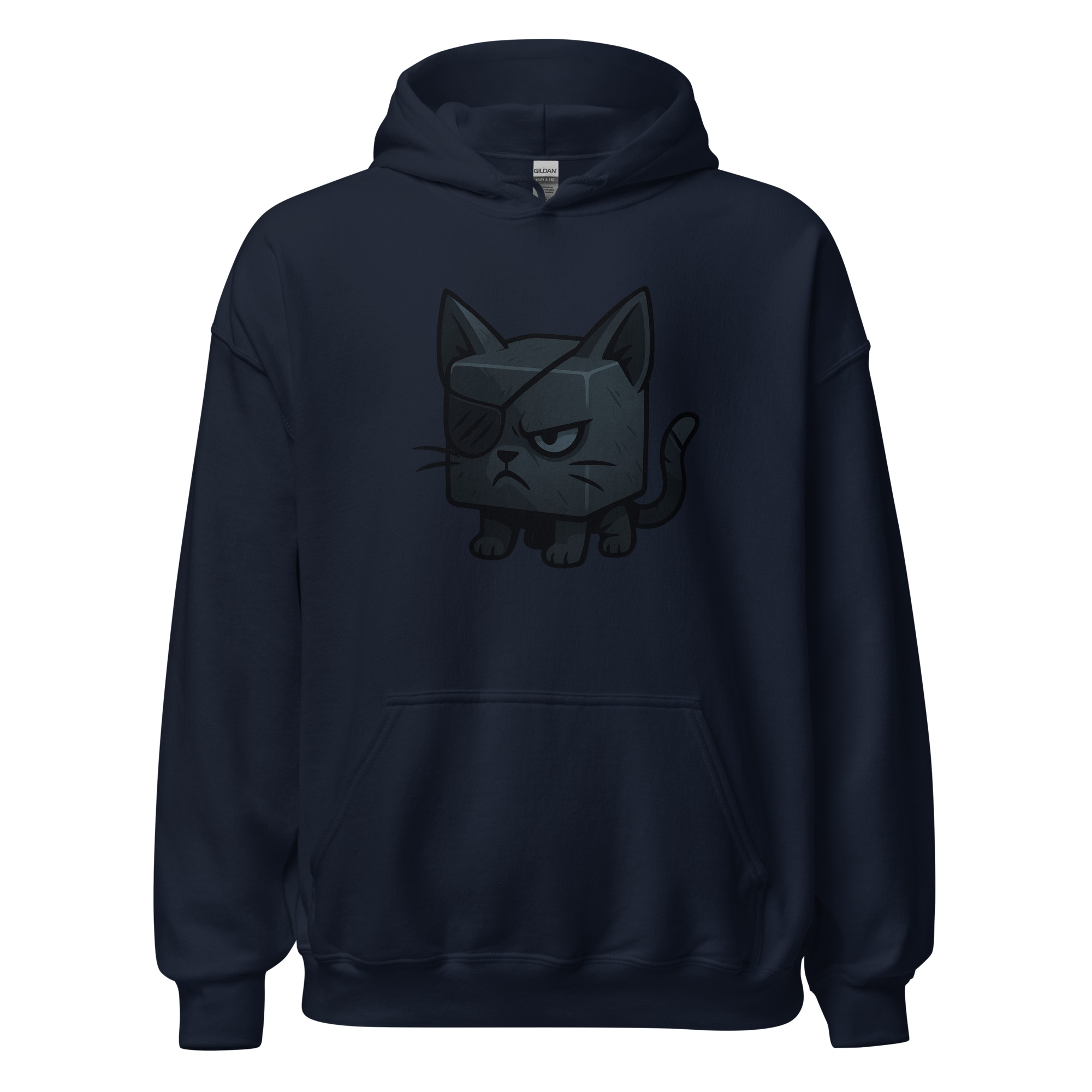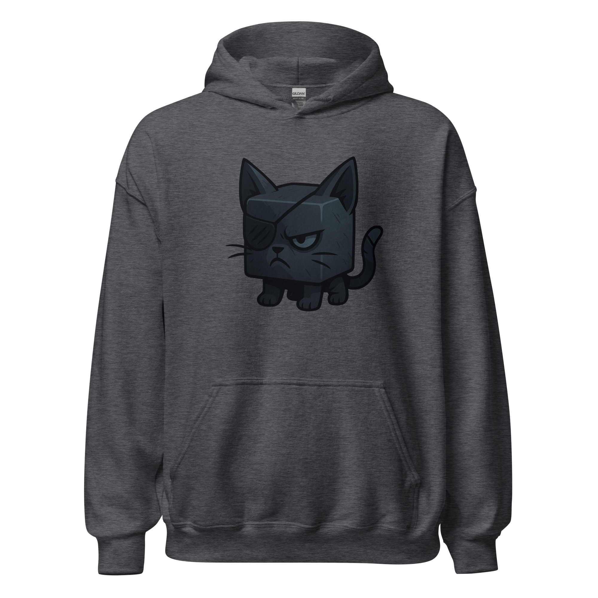 Ein Würfelkater mit grimmigem Blick und Augenklappe. Teil der Dicemals Reihe, einer Serie von Würfeltieren im Dark Cute Style.