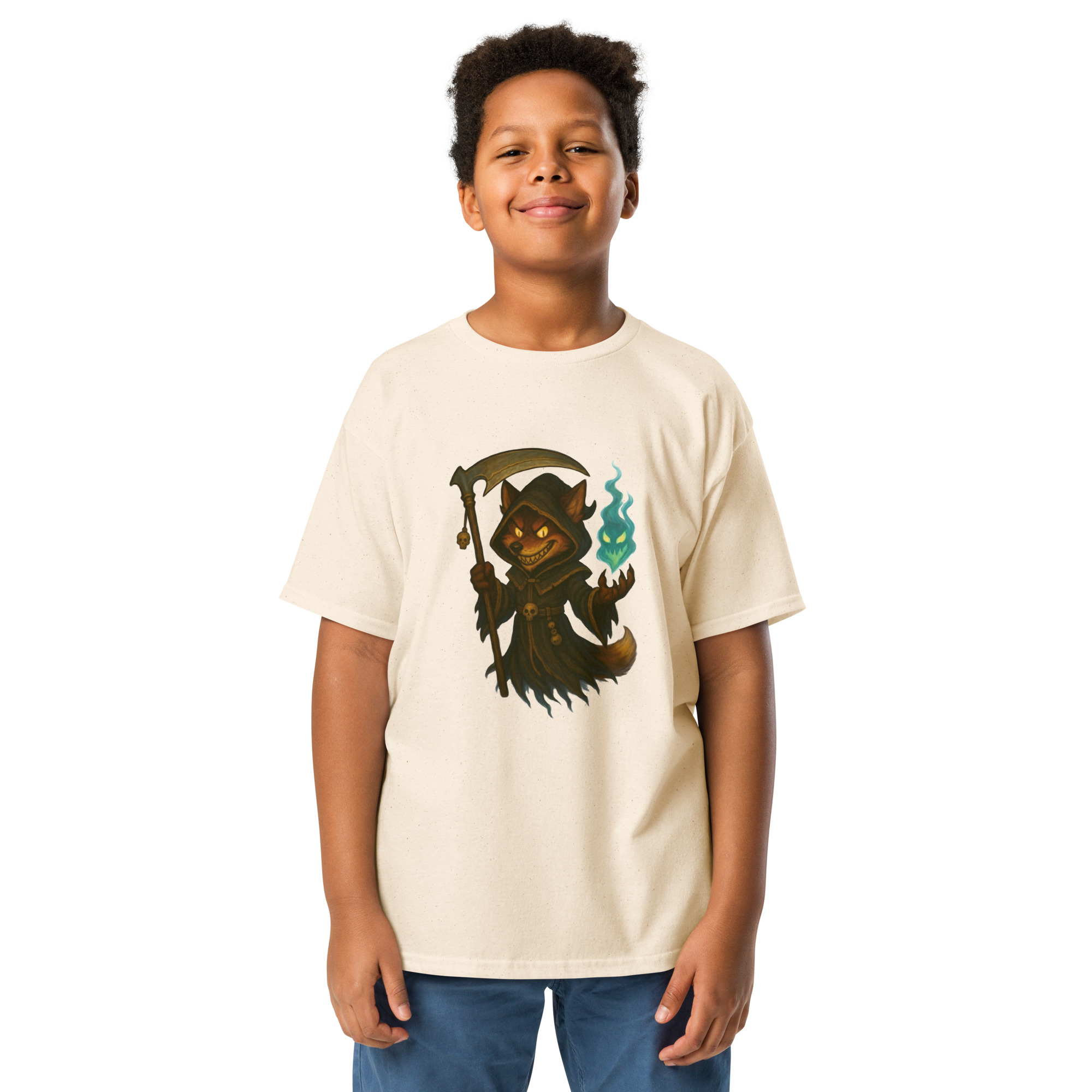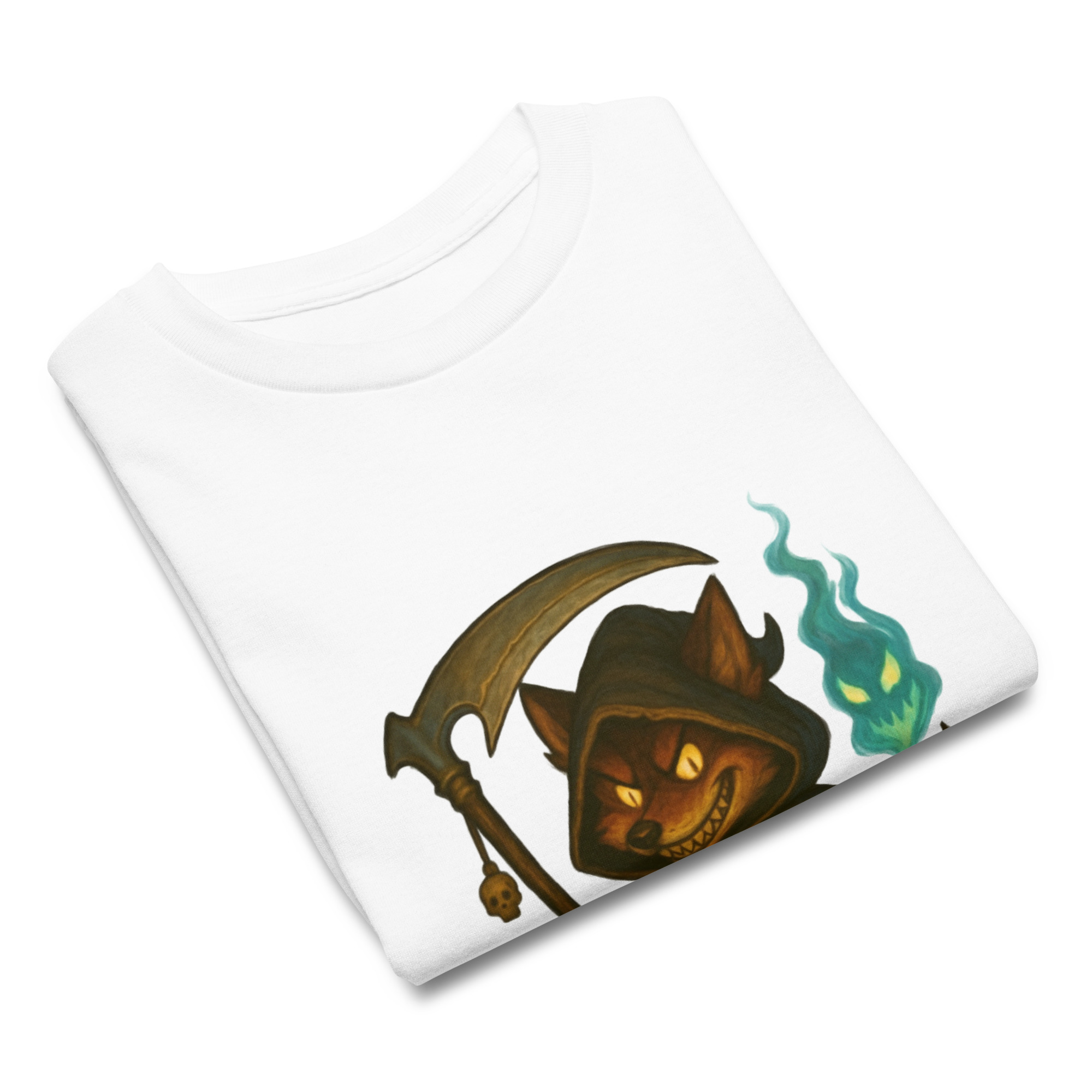 Ein Fuchs als Sensenmann mit leuchtender Sichel und einer entflammten bläulich-grünen Seele über seiner Krallenhand – düster und atmosphärisch.